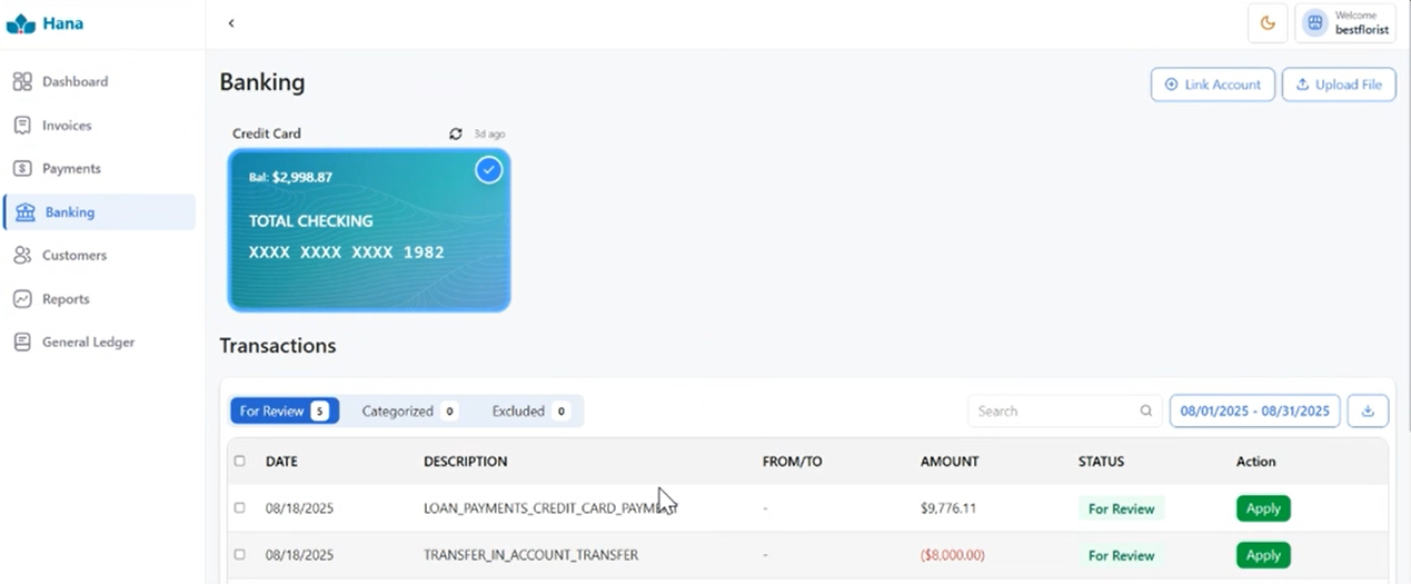 Link Your Account: Connect your bank directly to Hana Accounting. Transactions are pulled in automatically.